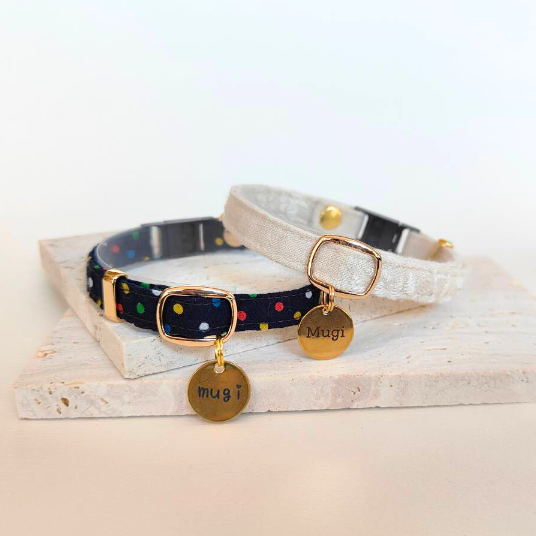 高品質コットン首輪 ランチョンマットブランドEMYS'さんにお願いして、製作で出てくる製品には足りないハギレを利用して猫の首輪を作ってもらっています。上質な生地を使用した高品質首輪です。