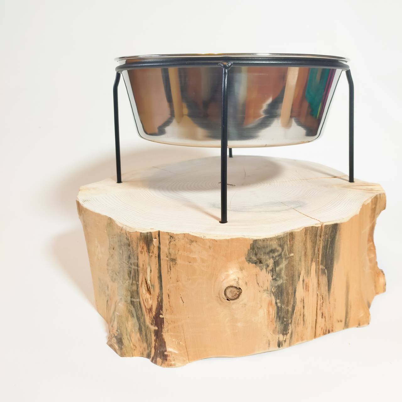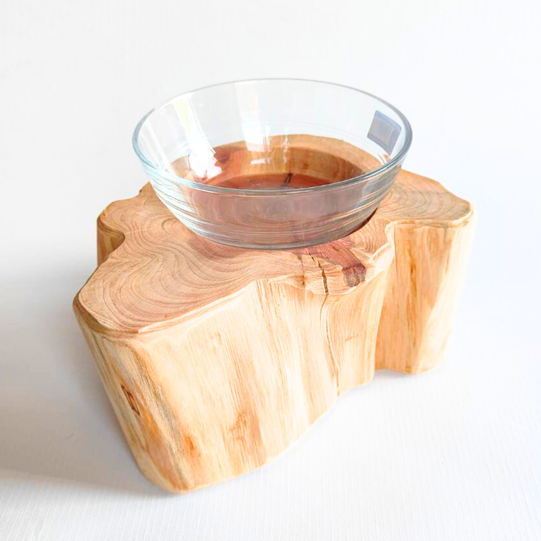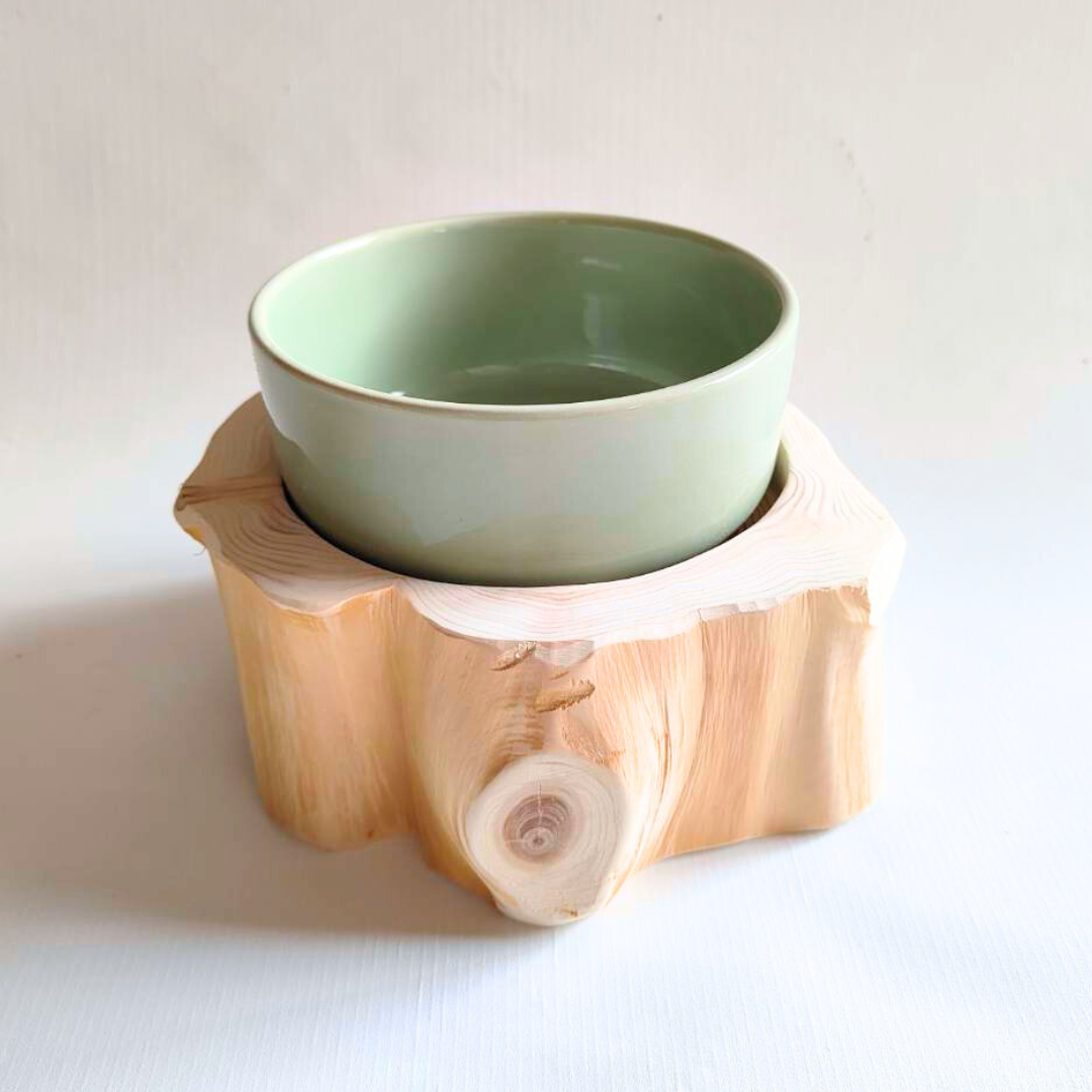 自然の丸太を使用した餌台フードボウルです。 高さがあるので食べやすく、飲みやすくなっています。 ➡with dogs Scenery of ...(京都のトリミングサロン)様にて 実際に手に取ってご覧いただけます。※全商品ではありません。