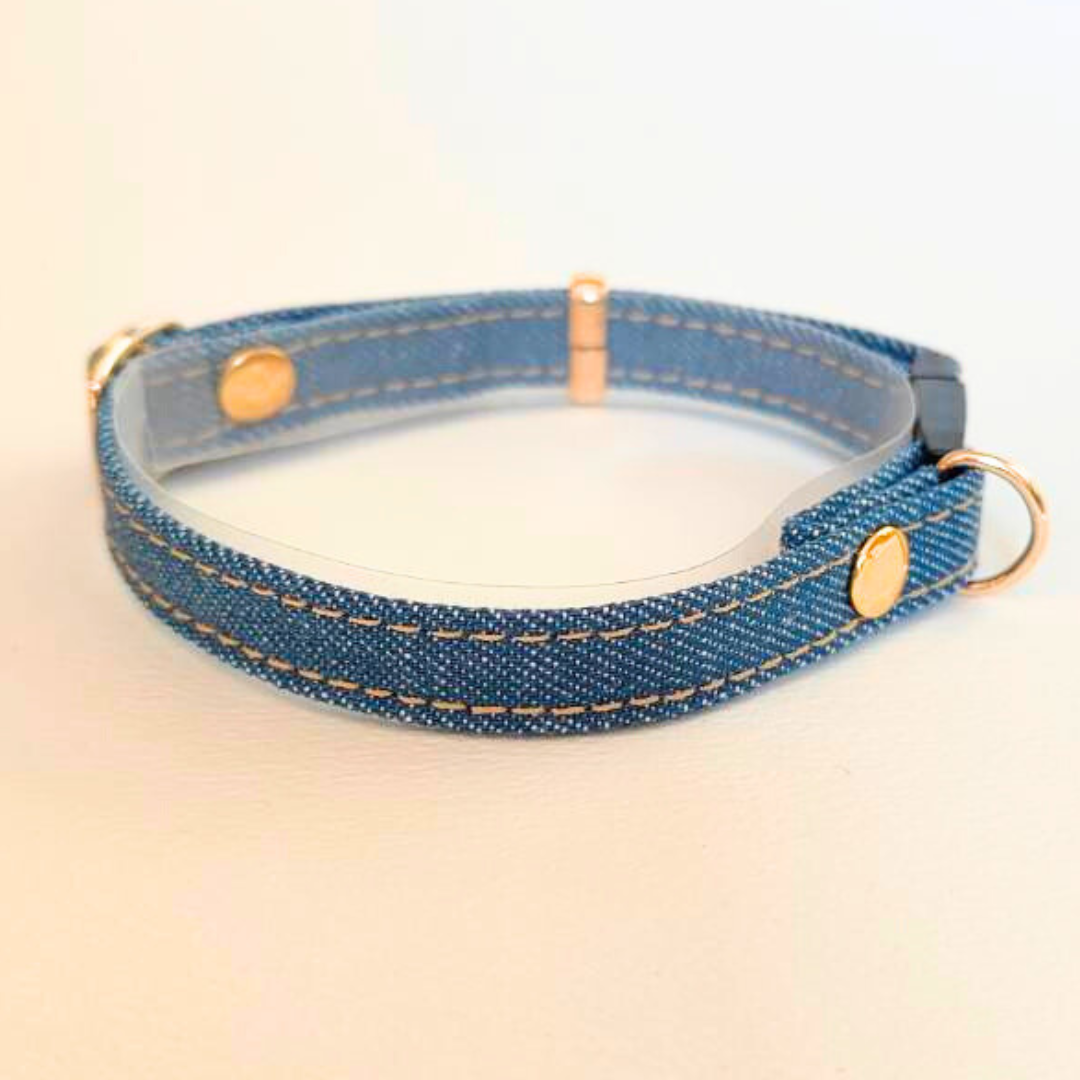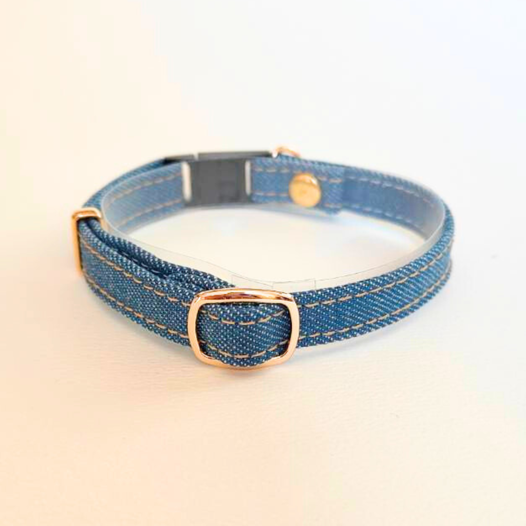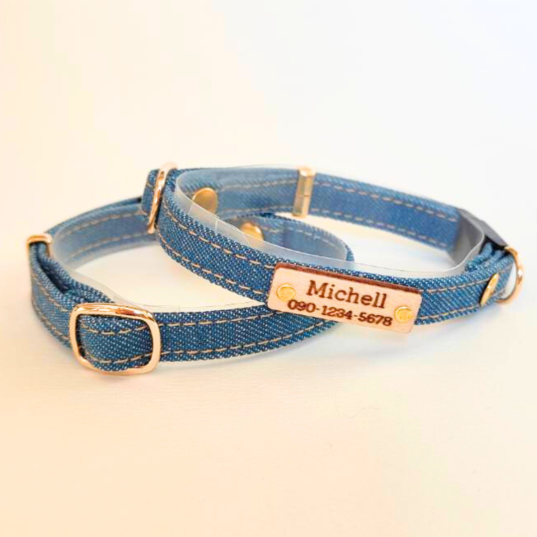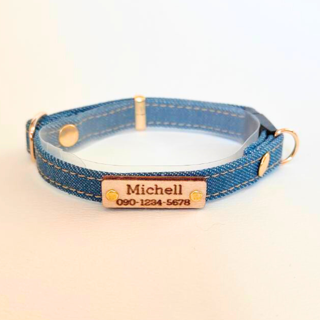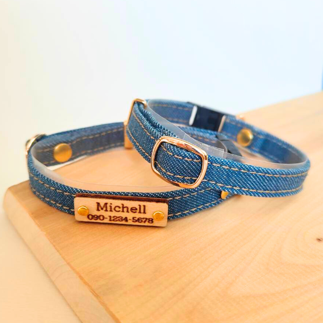 アップサイクルデニム首輪 オプション木製迷子札 セーフティバックル 猫 首輪