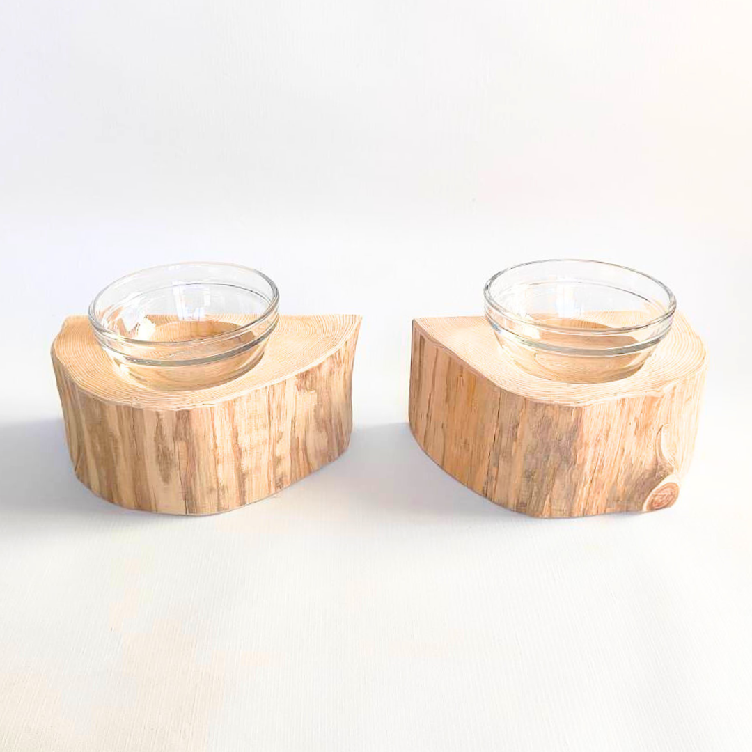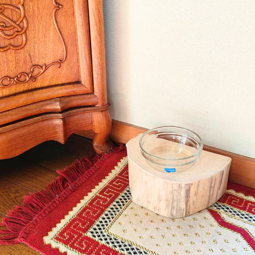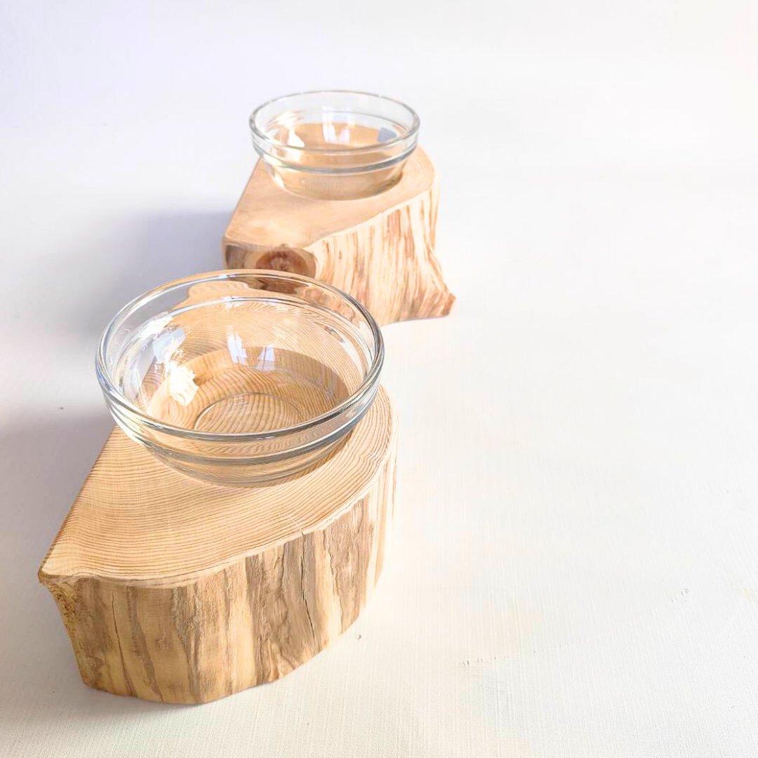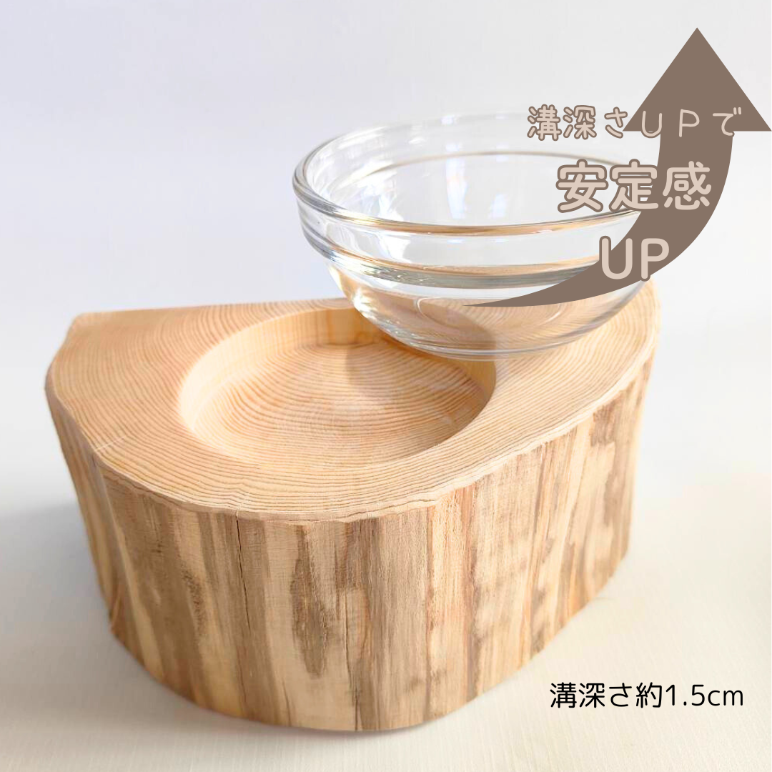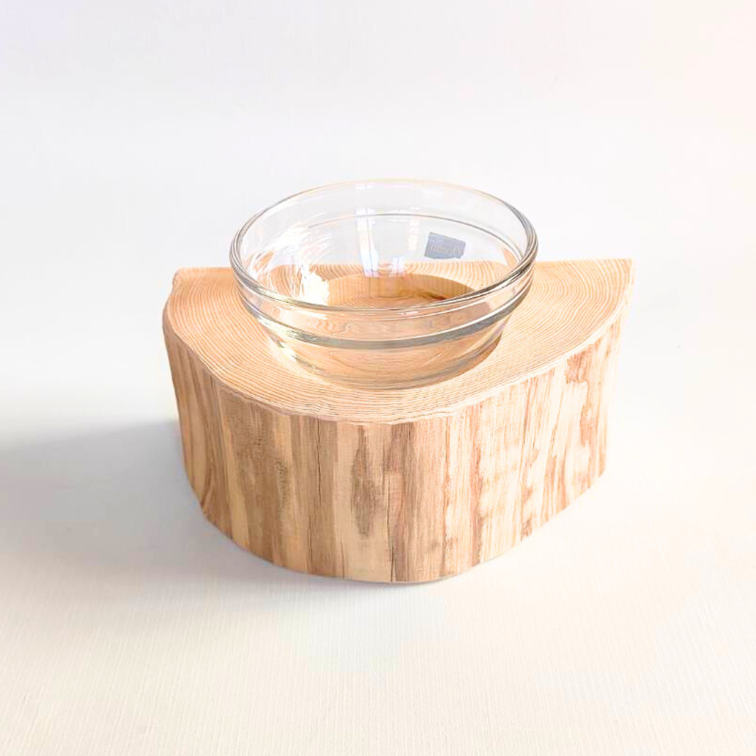 半割り 壁に沿って置ける しゃれ木高野槙のログボウル(焼き加工なし) ガラスボウル付 ごはん台 フードボウル 餌台 エサ入れ 1個販売