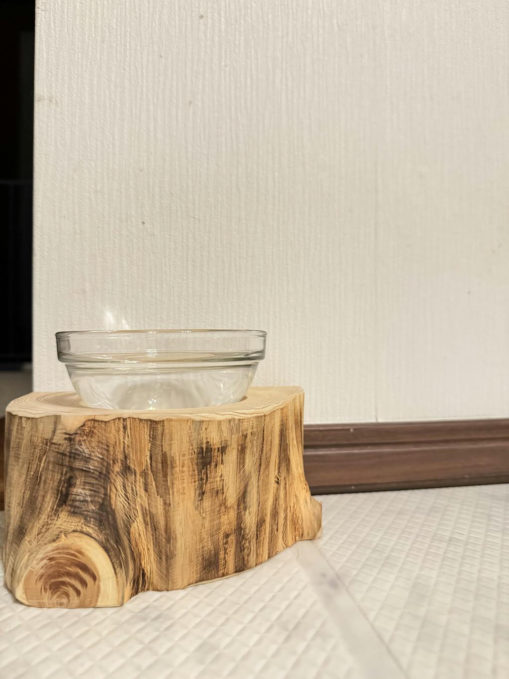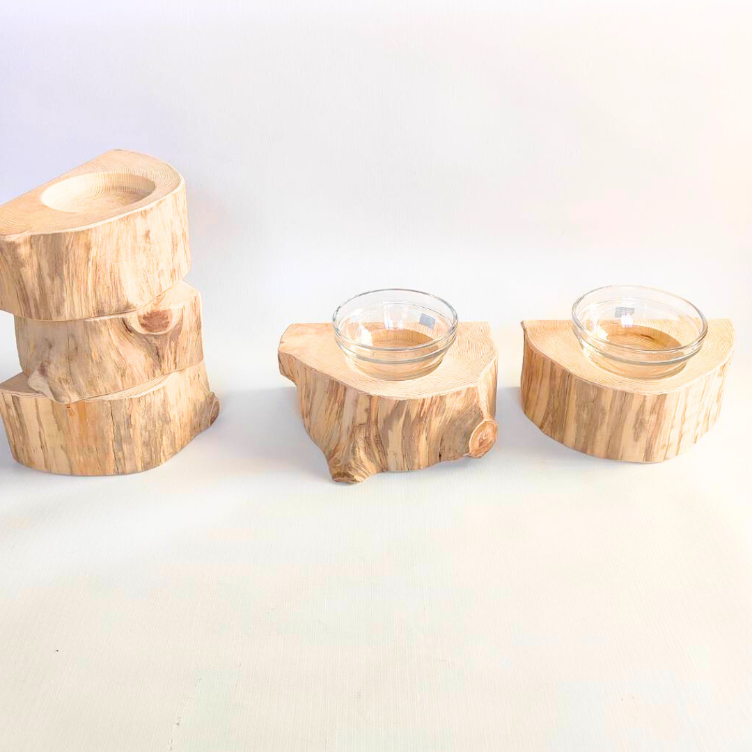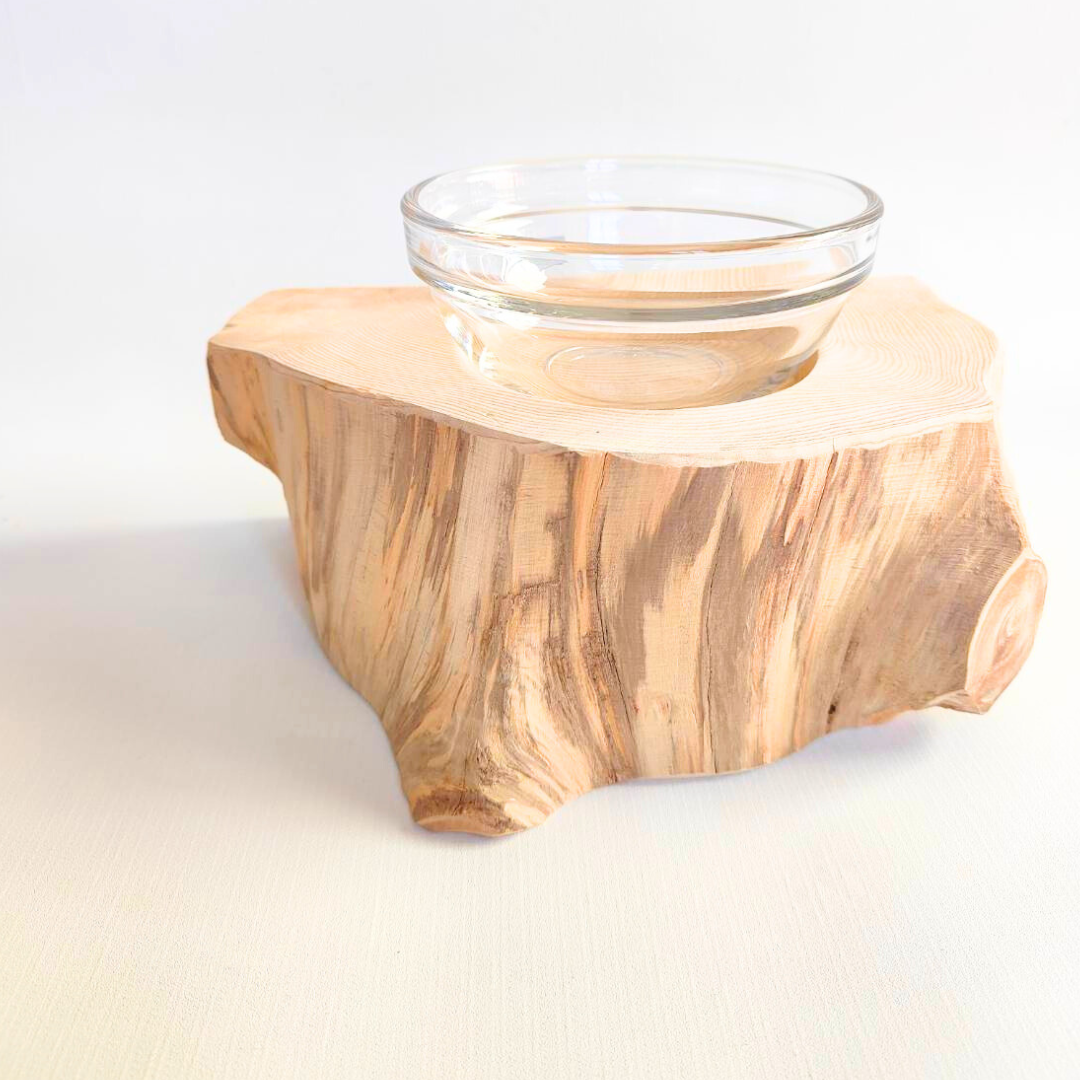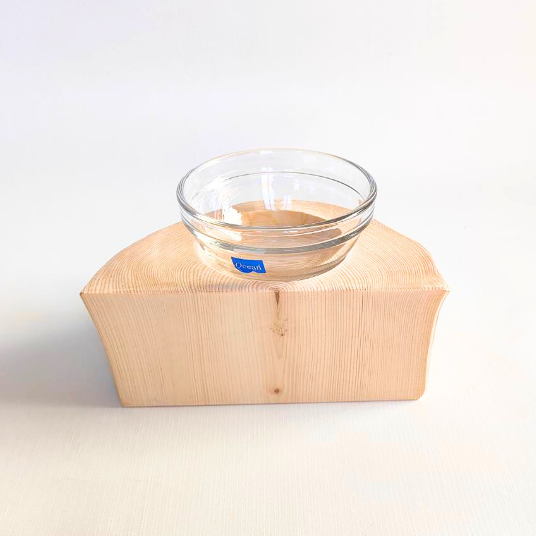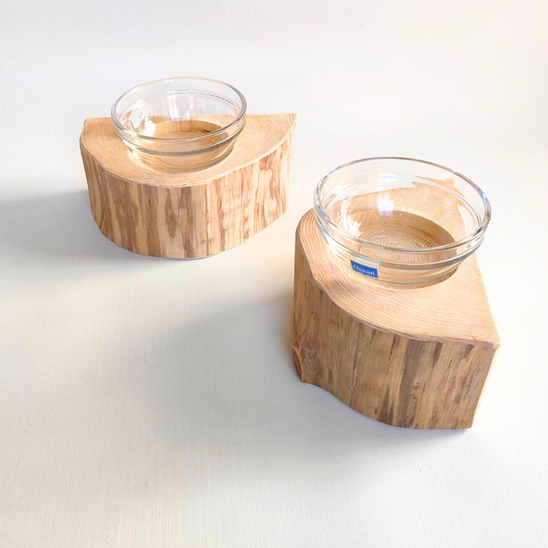 半割り 壁に沿って置ける しゃれ木高野槙のログボウル(焼き加工なし) ガラスボウル付 ごはん台 フードボウル 餌台 エサ入れ 1個販売