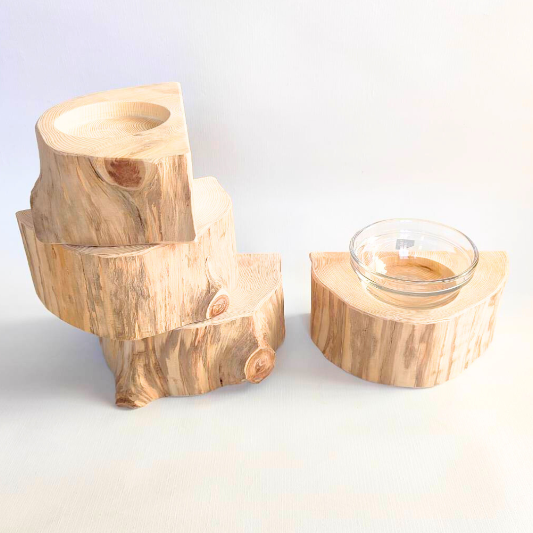丸太の餌台は高さがあるので急いで食べてしまうワンちゃん猫ちゃんの吐き戻し防止になります。