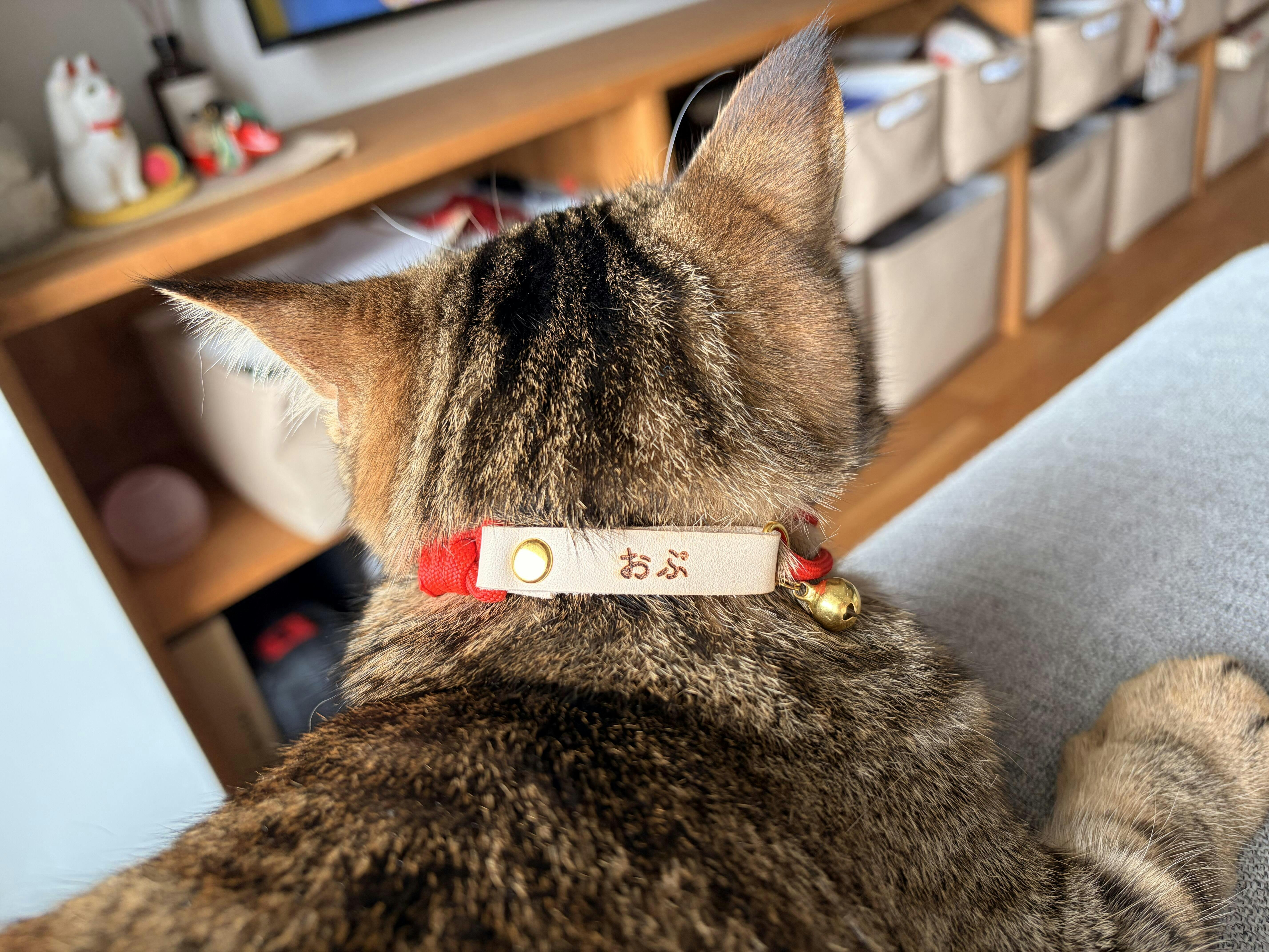 猫たち(2匹)をキャンプに連れて行くことが多いため、万が一迷子になった時用にネームプレート付きの首輪を購入しました。届いてすぐ、留め具が外れてしまう不良がありましたが、相談したところ初期不良とのことで作り直しをしていただきました。猫たちも嫌がることなく付けてくれています。