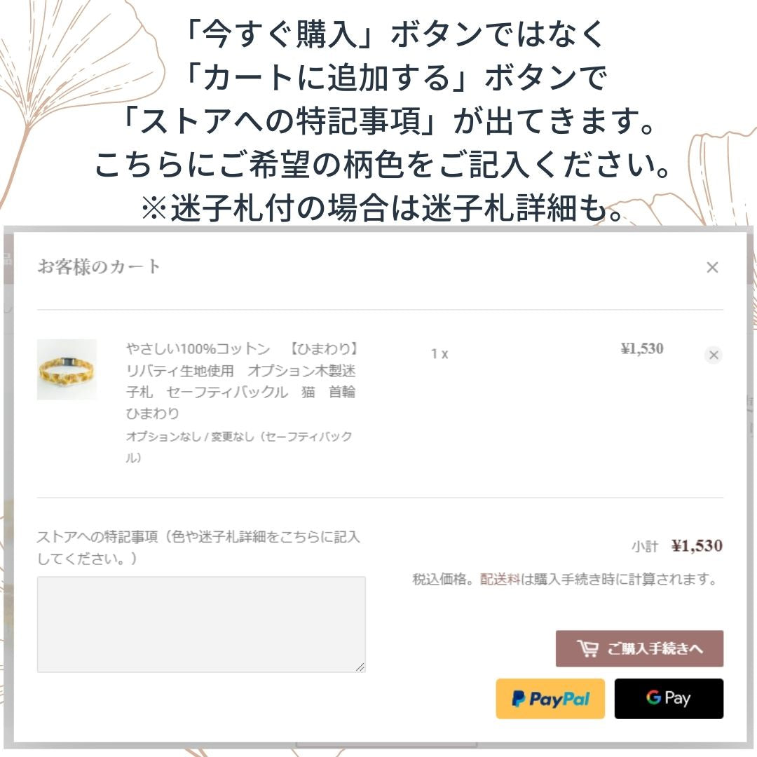 「ストアへの特記事項」にご希望の「首輪カラー」の記載をお願い致します。